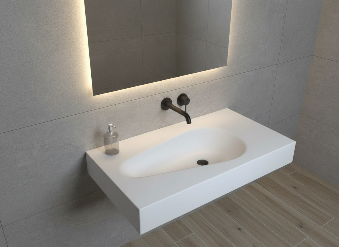 Alliez design épuré et fonctionnalité avec notre plan vasque intégré monobloc en Corian solid surface . Conçu d’une seule pièce, ce modèle sans joint offre une continuité parfaite entre la vasque et le plan de travail, pour un rendu minimaliste, élégant et hygiénique.
